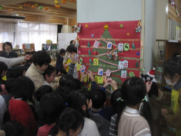 最後には、みんなで図書室のクリスマスツリーに飾りつけをしました。